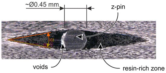 The sectional plane is located in the area of a circumferential notch. The resin-rich areas have a limited dimension, which depends e.g., from the z-pin diameter and the fibre tension of the prepreg material. If these areas cannot be completely filled with the resin during the curing process, voids (e.g., entrapped air) directly at the z-pin can occur, which may act as crack initiators under laminate loading and thus significantly reduce the mechanical properties of the pinned laminate.