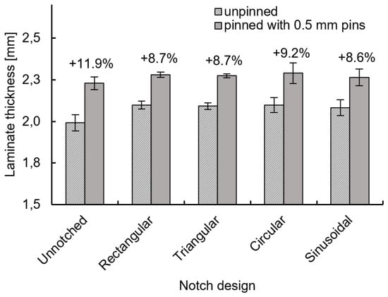 Also, the pins work against the compaction during the curing process, so that increased laminate thicknesses can be measured in the pinned areas, compared to unpinned laminates with the same laminate structure [12,16,39]. For all laminates investigated, the resulting laminate thicknesses were measured. The laminate thicknesses of the pinned samples were measured in the areas of the z-pin reinforcement as well as in the unpinned areas. Figure 4 shows the thicknesses of the unpinned and pinned areas of the specimens reinforced with notched pins with constant notch depth of 20 m and different notch designs, compared to the values of the specimens with unnotched pins.