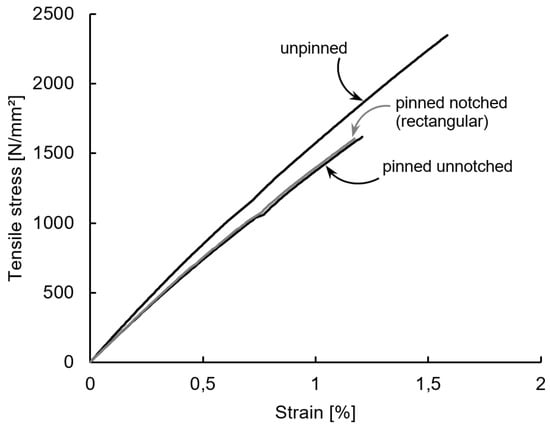 The pinned specimens with unnotched z-pins exhibit reductions of the Young’s modulus of 20% compared to the unpinned laminates. This corresponds to the findings of Hoffmann et al. [45], which also measured a decrease of the tensile modulus of 20%, with the same z-pin parameters in unidirectional laminates. In their investigations on unidirectional and quasi-isotropic laminates, Chang et al. [39] also described reductions of the tensile modulus compared to the unpinned laminates. For unidirectional laminates reinforced with big pins (0.51 mm diameter), a reduction of the tensile modulus of 5% for each 1% increase in z-pin density was found. The authors describe that the swelling of the laminate and the resulting reduction of the fibre volume fraction and, more significantly, the misalignment of the laminates fibres in-plane and out-of-plane are responsible for the reductions measured. However, the present study reports higher reductions, suggesting that a higher proportion of the fibres of the laminate were cut and/or deflected in the thickness direction in the investigated laminate material. A higher fraction of misaligned fibres in-plane, compared to the findings of Chang et al. [39], are unlikely, as they are primarily dependent on the diameter of the pins and the laminate structure, which are similar to the parameters investigated.