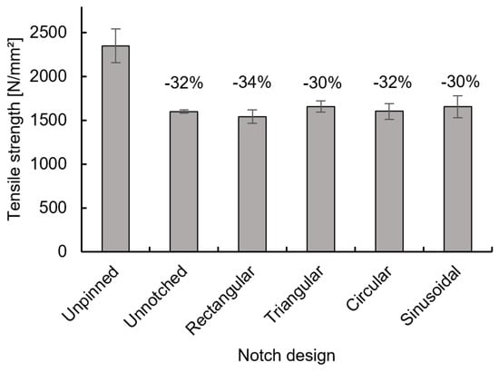The tensile strength values were determined for all specimens. In Figure 6 the average values of the tensile strength and standard deviation values of unpinned as well as pinned specimens with and without circumferential notches are presented.