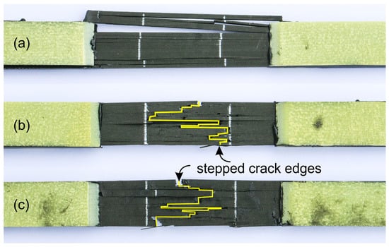 For the unpinned sample Figure 7a, the typical catastrophic failure can be described that is accompanied by immediate longitudinal crack propagation along the reinforcing fibres splitting the specimen into smaller sub-laminates. Thereby the maximum stress values of these sub-laminates are significantly exceeded, resulting in this immediate failure. In contrast, for pinned specimens with unnotched pins, the fractures of the fibres of the resulting sub-laminates are located directly at the positions of the z-pins, as shown in Figure 7b. This results in a stepped fracture surface between the halves of the specimen. Similar behavior can be observed for specimens with notched pins, as shown in the Figure 7c. This indicates that notching of the z-pin surface is not affecting the fracture behaviour when using 3D reinforcement with notched z-pins.