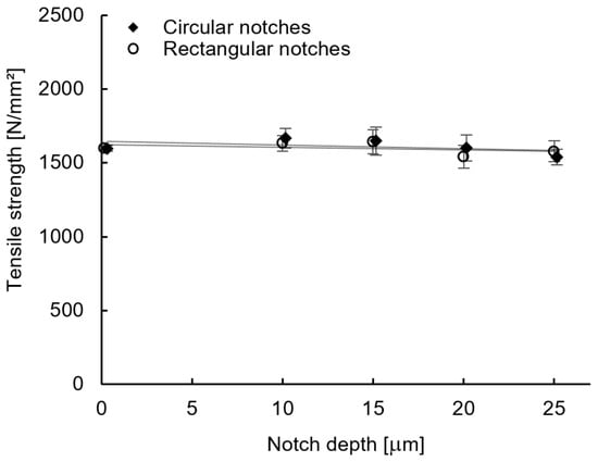 Considering the impact of the notch depth on the resulting maximum tensile stress, as shown in Figure 8 for rectangular and circular notch designs, it can be concluded that no significant effect with increasing notch depth can be observed.
