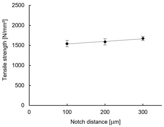 The evaluation of the measured values of the specimens with rectangular notches with a constant notch depth of 20 m and varying notch distances is shown in Figure 9.
