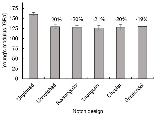 By comparing the values of the specimens with unnotched pins with those of the notched pins, no significant difference can be identified. The reductions in the Young’s modulus of the specimens with notched pins range from 19% to 21%, compared to the unpinned specimens, as shown in Figure 10. Thus the specimens with notched pins display similar characteristics compared to the specimens with unnotched pins. This indicates that with similar notch definitions (depth and distance) the notch design has no influence on the Young’s modulus. It can also be concluded that when inserting the pins, whether notched or unnotched pins are used, the same microstructural changes responsible for the reduction of the modulus will be induced.