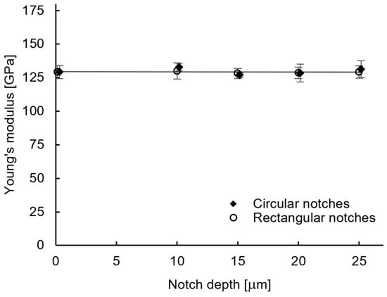 The results of the Young’s modulus in dependency on the notch depth for circular and rectangular notch designs are presented in Figure 11.