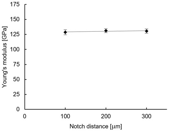 Average values of Young’s modulus and standard deviation for z-pinned reinforced unidirectional carbon/epoxy composites with notched z-pins, circumferentially notched with rectangular notch design with constant notch width of 100 m and notch depth of 20 m, at different notch distances.