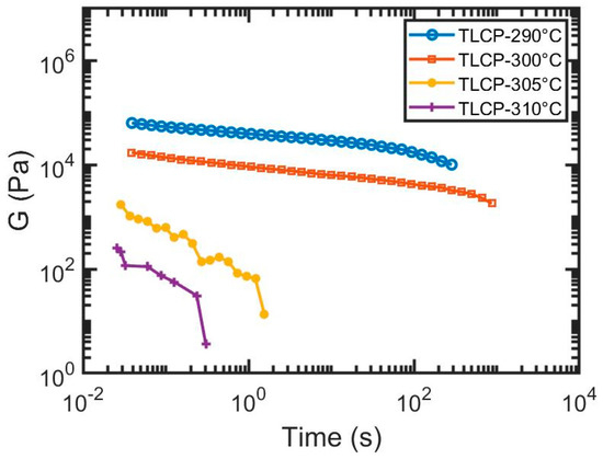 To generate the in situ TLCP/glass fiber/polypropylene composites, the processing temperature has to be optimized using a series of rheological analyses. One advantage of blending TLCPs with other thermoplastics is the reduction in melt viscosity, which results in an improvement of the polymer blend’s processability. TLCPs have lower melt viscosity when compared to many thermoplastics, and to take advantage of this, thermal and rheological properties of TLCPs need to be examined. The TLCP used in this study has a melting point around 280 °C [35]. The rheological properties of TLCP above its melting point are critical in the processing of this material. Transient behaviors of TLCPs are related to the rigid TLCP molecules and domain structure [37,38]. The transient responses of pure TLCP at various test temperatures, following step strain were measured, as shown in Figure 1. The relaxation modulus (G) is plotted against time on the log-log scale. At the testing temperatures below 305 °C, the relaxation modulus decreases gradually over time, producing a long relaxation tail. This is graphically demonstrated by the relaxing curves at 290 and 300 °C. On the other hand, the relaxation modulus (G) sharply dropped when the temperature was equal and above 305 °C. It is speculated that the slow decay of the relaxation modulus at low temperature is due to the presence of unmelted crystals in the TLCP [37]. As the temperature further increased, TLCP crystals change to a liquid phase, causing the long relaxation tail to disappear, as seen by a dramatic drop in the relaxation modulus at the temperatures of 305 and 310 °C.