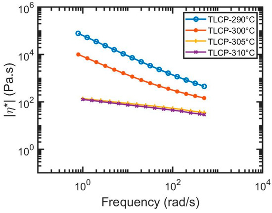 Complex viscosity of TLCP at temperatures from 290 to 310 °C.