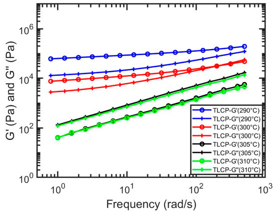 The viscoelastic properties of pure TLCP at different temperatures were studied using oscillatory shear rheology. Figure 3 illustrates the change of storage (G′) and loss (G″) moduli of TLCP as the function of angular frequency at varying operational temperatures. Storage modulus and loss modulus measure the stored energy and energy dissipated as heat, respectively. At 290 °C, the storage modulus was higher than the loss modulus over the entire frequency range, suggesting that the TLCP exhibits a solid-like character. After a 10 °C increase, the curves for G′ and G″ crossover at 200 rad/s. The crossover frequency characterizes the transition of a polymer melt from the elastic (solid-like) to the viscous (liquid-like) state. At 305 °C and above, the G″ is higher than G′ at all angular frequencies, indicating that the TLCP behaves like a viscous liquid. The G″ > G′ over the entire frequency range is probably due to the complete melt of TLCP crystals. The transitioning effect observed from the dramatic change of viscoelastic properties of TLCP with an increase in the testing temperature reinforces the notion that the existence of TLCP crystals significantly impacts the rheological behavior of TLCP.