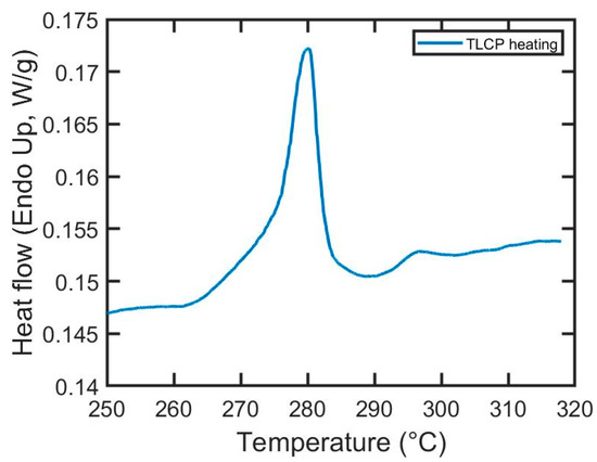 A differential scanning calorimeter (DSC) was utilized to study the melting behavior of pure TLCP and to confirm any residual crystals of TLCP at temperatures above 280 °C. Two distinct transition phases were observed during the melting of TLCP, as shown by the two peaks in the DSC heating scan in Figure 4. The first peak was observed at around 280 °C and the second peak was observed around 297 °C. The different crystal structures develop during the process, leading to the mesophase transition of TLCP [40]. Literature reports state that the melting point of TLCP is around 280 °C [35]. Several studies have successfully melt processed the PP with TLCP between 285 to 300 °C, resulting in improved mechanical performance [35,41,42]. Nevertheless, to utilize the low viscosity effect of TLCP, the processing temperature must be high enough to melt all the TLCP crystals. Thus, the melting endotherm ends around 305 °C, which confirms that the TLCP crystals have completely melted and shows consistency with the results obtained from the rheological analyses.
