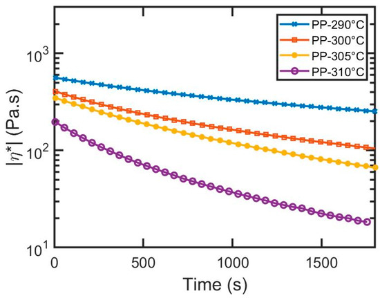 Before processing the in situ hybrid GF/TLCP/PP composite, the PP used as the matrix of the composite needs to be tested to make sure it can withstand the high temperatures for processing. The high processing temperature improves the processability of the polymer blend, but also raises a concern regarding the thermal degradation of the polypropylene. The thermal stability of polypropylene was measured using the isothermal time sweep rheological test. Figure 5 shows the complex viscosity (|η*|) of polypropylene as a function of time at different experimental temperatures. The isothermal rheological tests were carried out under a nitrogen atmosphere to simulate the nitrogen purge hopper used during the injection molding process. The overall residence time exposed to high temperature for processing was around 240 s.