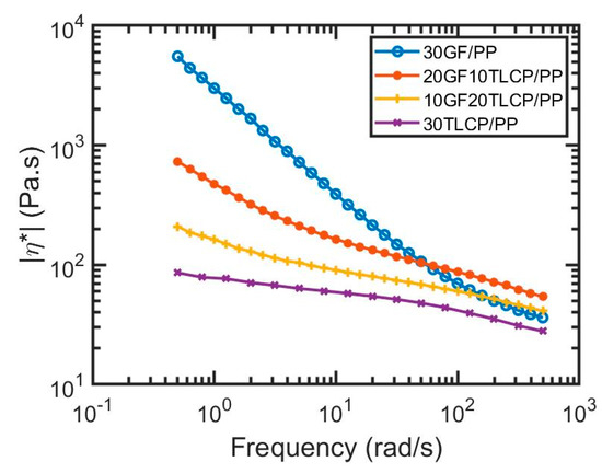 One concern regarding this rheological test is the thermal degradation of polypropylene at 305 °C, which decreases the complex viscosity over time. This may cause the ill-defined viscosity data at high frequency (rheological test sweeps the frequency from low to high), but this frequency sweep test provides a method to qualify the benefit of a higher TLCP concentration, resulting in the lower viscosity of a hybrid composite.