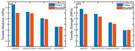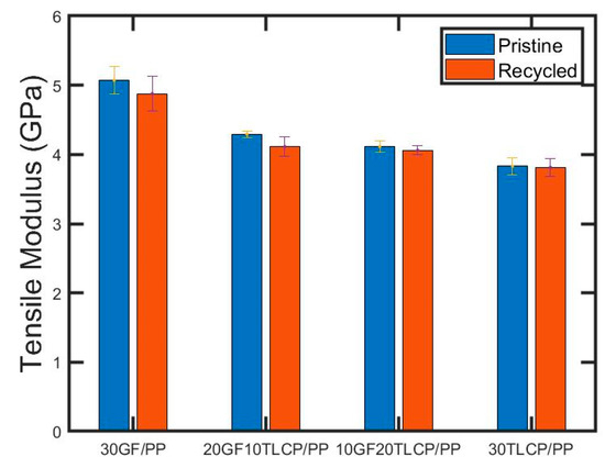 The first injection molded samples were defined as pristine materials (blue). The recycled composites (red) were obtained by grinding the pristine materials and re-injection molding into end-gated plaques. The tensile properties of each hybrid composite are depicted in Figure 7, Figure 8 and Figure 9. The modulus of pristine 30 wt % GF/PP was 5.07 GPa, and the modulus of pristine TLCP/PP was about 3.83 GPa. The lower modulus of the TLCP blend was speculated to have originated from the injection molding process, which is unable to achieve high elongational deformation. The tensile modulus of 26 wt % TLCP/PP is reported to be 13.5 GPa when the sample is prepared by strand extrusion [47]. By replacing 10 wt % of the TLCP with glass fiber, the tensile modulus improved by 7.4%. The tensile modulus of the hybrid composite fell between the 30 wt % GF/PP and TLCP/PP. To determine the effect of mechanical recycling on the hybrid composite materials, the pristine composites were ground and injection molded into end-gated plaques. After recycling, the tensile modulus of the GF/PP composite dropped to 4.87 GPa while the tensile modulus of TLCP/PP remained the same. The major factor for the decrease in the GF/PP composite modulus was the fiber length attrition during the recycling process [34]. The TLCP was able to regenerate the TLCP fibrils during the mold filling process, and the TLCP-filled composites maintained their mechanical performance after mechanical recycling. In addition, the recyclability of a glass-filled composite was improved with the presence of TLCP, as seen with the 20GF10TLCP/PP hybrid composite only losing 4.1% of its modulus after recycling.