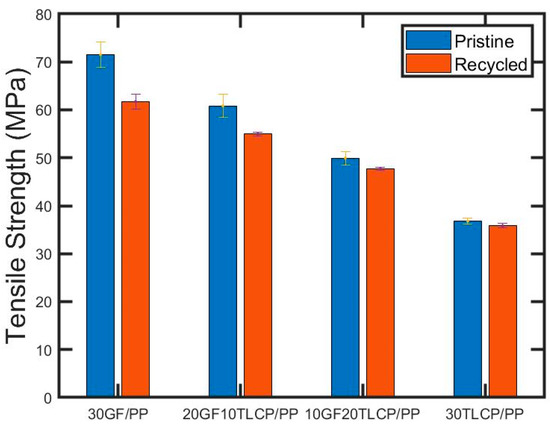 The tensile strengths of the pristine and recycled hybrid composites are shown in Figure 8. The tensile strength of pristine GF/PP was much higher than that of TLCP/PP because the tensile strength of the TLCP (~0.5 GPa) was lower than the tensile strength of GF (~3.5 GPa). The same difference in the properties of the composites was also expected to be seen [47,48]. By adding glass fiber into the TLCP blend, the tensile strength was significantly enhanced. Replacing 10 wt % TLCP with glass fiber enabled the improvement of the tensile strength from 36.8 to 50.0 MPa. Mechanical recycling imposes different degrees of impact on the tensile strength of hybrid composites. The tensile strength of 30 wt % GF/PP dropped from 71.5 to 61.7 MPa after recycling, but there was only a 9.6% decrease in the tensile strength of 20GF10TLCP/PP. Just as for the tensile modulus, this was due to the severe fiber length attrition during the blending and grinding processes. The higher content of glass fiber and higher melt viscosity accelerated the fiber breakage during processing. The short glass fiber composite showed lower mechanical properties than the long glass fiber composite [46]. The higher content of TLCP in the hybrid composite lessened the decrease in the mechanical properties of the composites after recycling.