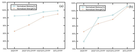 To evaluate the recyclability of each composite material, the mechanical properties of the recycled composite were compared against the pristine counterpart. The normalized values of the tensile properties of the hybrid composites are presented in Figure 10. The normalized values were obtained by dividing the tensile properties of the recycled composites by their pristine material properties. For the tensile properties of the hybrid composites in the flow direction, the normalized values increased with increasing weight fraction of TLCP, suggesting an improvement in the recyclability with the presence of TLCP (Figure 10a). The 30 wt % GF/PP only retained 86% of its tensile strength after recycling, and 10GF20TLCP/PP retained 96% of its tensile strength compared to the pristine composite. The tensile modulus in the flow direction was not significantly impacted by mechanical recycling. The different impact of recycling on tensile modulus and strength is due to the different sensitivity of each property to the change in fiber length [46].
