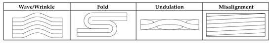 General definition of deviations from the intended fiber orientation (i.e., wave/wrinkle, fold, undulation, and misalignment).