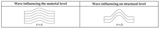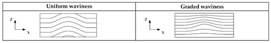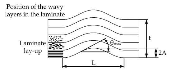 In general, the shape of fiber waviness is described by the ratio of amplitude to wavelength. Davidson and Waas [11] introduced six parameters to characterize the wave, indirectly including the laminate thickness. While amplitude A and wavelength L are most commonly used to describe the wave (Figure 2), the maximum deviation θmax is considered to have the greatest impact on the mechanical properties. Important influencing parameters such as maximum deviation of the fiber orientation from the original orientation, as well as the laminate thickness [12], have received little attention in previous investigations. The wave pattern is typically represented mathematically as sinusoidal waves [13,14]. El-Hajjar and Petersen [15] used a Gaussian function to capture the bell curve of wavy plies, which was found to better represent the wave geometry. Nevertheless, there are a few more parameters that can influence the mechanical behavior and thus have to be considered. Results in [16] show that the position of wavy layers in the cross-section of a laminate also has a significant influence on the strength reduction. A more outward position of wavy layer leads to a greater decrease in strength, since the layers on the edge of the laminate are supported only one-sided and; therefore, fail earlier.