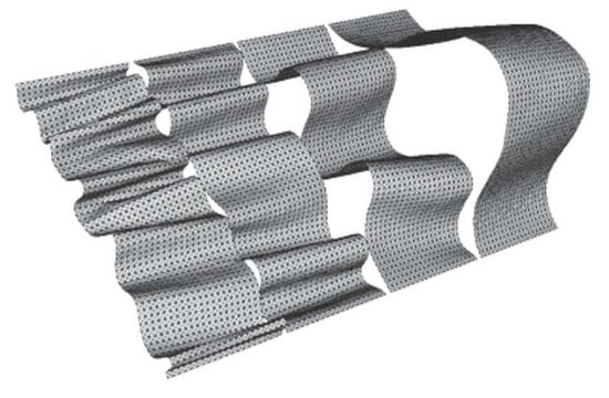 Wrinkling in compression of a woven reinforcement strip with different bending stiffness (from left to right 1, 10, 102, 103 N mm−1) [19]. Reprinted from Phil. Trans. R. Soc. A, Vol. 374, Modelling the development of defects during composite reinforcements and prepreg forming, page 5, (2016), with permission from The Royal Society Publishing.