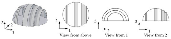 When a material, regardless of whether it is dry or pre-impregnated, is draped around a double curved surface (e.g., hemispheres [1,26] or joggled geometries [5,27,28,29,30,31]), the path length difference of the reinforcement and the path on the geometry to which the material must map on the surface can vary significantly, thus leading to a pronounced risk of wrinkling of the layers due to path length differences at the structural level (macro scale). The drapeability of a material describes its ability to conform to the mold surface without fiber distortion, movement, and out-of-plane buckling. The complexity of the final part tremendously influences the occurrence of fiber waviness. Potter et al. [1] stated that only a slight difference in path length can lead to obvious fiber waviness. A schematic illustration of path length differences between the edges of tows on the surface of a hemisphere is shown in Figure 5.