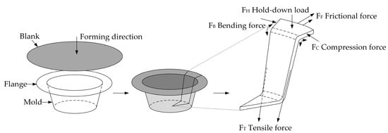 In diaphragm forming, the outer edges of the blank are pressed onto the mold flanges before the central area is drawn into the cavity when using female tools. In addition, the friction between the blank surfaces and the diaphragm create biaxial tensile stresses in the blank as the diaphragm is stretched, which prevent wrinkle formation due to out-of-plane buckling [44]. Additional forces that can reduce the formation of wrinkles in diaphragm forming processes originate from the inherent resistance of the material itself and from the restraining force supplied by the diaphragm when it is stretched [45]. The combination of both prevents out-of-plane wrinkling in diaphragm formed components even in the absence of clamping or blank holder forces [44]. In addition to the suppression of wrinkle formation during press forming, according to [46], blank holders serve several more functions (e.g., they prevent the shrinkage of the blank during preheating, they maintain the fiber orientation in the softened blank when it is transferred from the oven to the mold, and they allow for a rapid transfer of the preheated blank to the mold without significant heat loss). Lin et al. [33] used experimental and numerical (FE) approaches to determine the effects of clamping and blank holding forces on the wrinkling behavior. In an example of 3D stamp forming [44], schematically illustrated in Figure 6, a reduction in area of the individual sections occurs when travelling into the cavity of the mold [47,48], inducing hoop forces, which resolve into compressive stresses perpendicular to the radius of the circular laminate. Fiber wrinkling and distortions are observed around the periphery of the cavity and in the flange area if stamping forces generated during forming exceed the critical buckling stress.