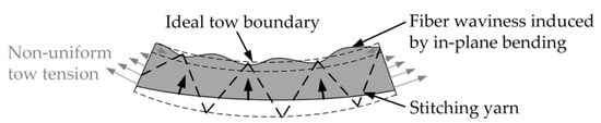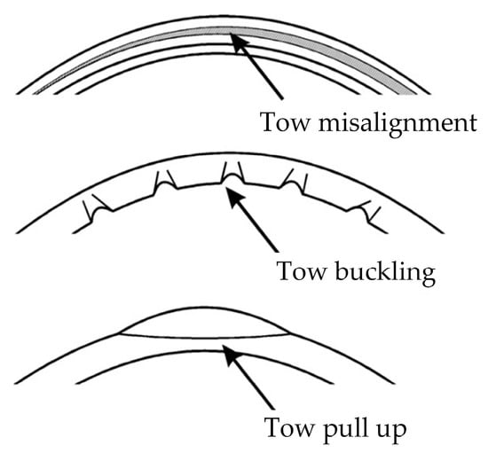 A schematic overview of tow steering defects is given in Figure 8. During steering, the tow is bent in the plane of the surface, which causes the fibers along the inner edge to be under compression and the outer edge to be under tension [50]. The inner edge of a tow placed along a curved trajectory tends to buckle in the form of localized out-of-plane waviness when the radius reaches a specific limit. This limit depends on parameters such as tow width and thickness, material, temperature control, etc. The tape/tow pull-off/pull-up [50,51] is caused by the tension state at the outer edge of the steered tow. The mechanical behavior of the fiber mainly determines the resulting cylindrical deformation mode. The fiber can be assumed to be almost inextensible, causing high tensile stresses. In combination with an insufficient prepreg tack, the tow starts to fold at the outer edge. In-plane fiber waviness and out-of-plane tow buckling are two effects that are assumed to occur subsequently [51].