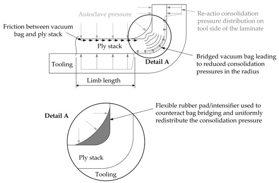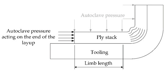 The autoclave consolidation of thick laminates in inner corner geometries can force the plies to move in the corner direction and form wrinkles due to the pressure acting at the end of the layup (Figure 10). This effect depends on the length of the laminate arm (limb length) as it influences the possibility of ply slippage and; therefore, can be addressed in design decisions and manufacturing planning. Further mechanisms of fiber waviness in internal radii are described in Section 4.3.4, of which may occur due to ply or vacuum bag bridging.