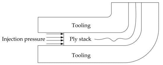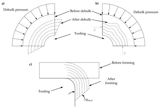 The relationship shown in Equation (3) is not valid in corner regions, because of the curvature, the material undergoes a more complex compaction (i.e., corner thinning and thickening). Typical values for the bulk factor [64] range between 1.08–1.17 for unidirectional plies and 1.15–1.4 for woven fabrics, meaning a ~8–17%, respectively, ~15–40% lower final thickness compared to initial laminate thickness. Levy and Hubert [66] developed an analytical model for the prediction of thickness deviation in both male and female corner regions by distinguishing between two phenomena. The friction dominated mechanism describes the interply friction which can hinder the layers from adapting to the mold geometry, thus preventing a proper compaction in the corner [18]. In a previous work by Hubert and Poursartip [67], they stated that even if interply slippage occurs, the bagged surface may differ from the facing mold surface due to the curvature in the corner. The available consolidation pressure in the part then differs from the expected vacuum bag pressure. Levy and Hubert [66] called this the pressure-dominated phenomenon. The pressure-dominated model predicts a lower bound, which is even negative (e.g., corner thinning) for the male case, and the friction dominated model predicts a higher bound.