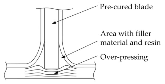 Large stiffened composite panels used in aircraft (e.g., pressure bulkheads) are often produced in a co-bonding process (i.e., pre-cured skins are co-bonded with wet stringers or also vice-versa), when pre-cured stiffeners are co-bonded to the wet skins and webs in an autoclave process. The co-bonding allows for an integral design that reduces or even eliminates drilled holes and mechanical fasteners. This, in turn, reduces complexity, weight, material, and tooling costs, etc. However, co-bonding may also lead to undesirable effects such as fiber waviness, voids, adhesive pockets, and resin pockets. These effects typically occur at the stiffener edges, as shown in Figure 12 [71].