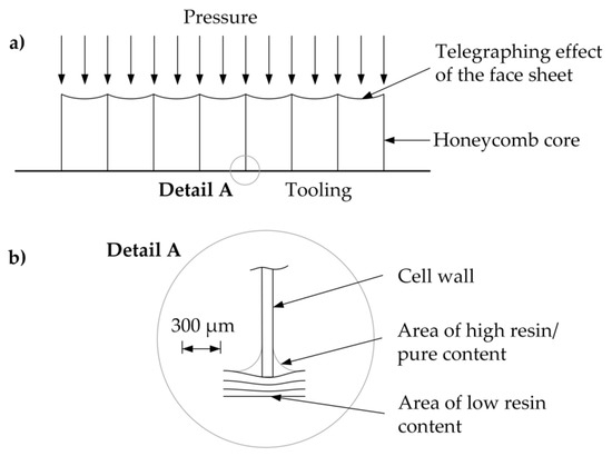 The telegraphing effect [74] is a result of the integral fabrication of sandwich structures. In production, the face sheets are placed directly on the honeycomb core in a wet lay-up process. The sandwich structure is then cured in the autoclave at elevated pressure. The use of large cell size honeycomb cores in sandwich structures in combination with thin skins may result in telegraphing effects, which are characterized by a dimpled outer surface, illustrated in Figure 13a. Waviness in form of indentions, Figure 13b, can also occur in the face sheets located at the tool side of the sandwich structure due to a high local consolidation pressure at the contact zone. These dimples are treated as small-sized waviness. A smaller cell size also improves the surface appearance and bonding quality due to its larger bonding area, but also increases its weight and cost. Secondary-bonded face sheets can completely eliminate telegraphing [75]. Riss et al. [76] developed an anti-telegraphing solution with additive layer manufactured honeycombs.