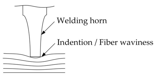 During spot welding of thermoplastic laminate stacks, indentations in form of wavy layers can occur due to the local elevated contact pressure of the welding horn and resulting softening material behavior caused by increased temperatures (Figure 14).