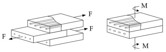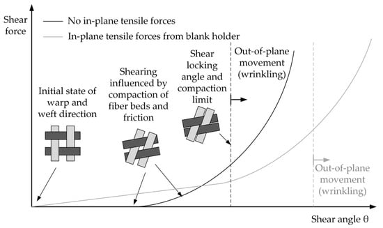 The deformation behavior of fiber-reinforced plastics is very different from that of isotropic materials. With isotropic materials, normal stresses only cause normal strains and shear stresses only shear strains. Within consolidated/cured fiber-reinforced plastics, this decoupling is only possible under certain conditions, if symmetries are introduced in the stacking sequence. In the most general case all elements of the (ABD) matrix [17], that relates cross-sectional forces and moments to mid-plane strains and curvatures which are occupied and thereby extensional, shear, bending, and twisting behavior are coupled. However, during the process, the matrix is either absent (e.g., in initially dry reinforcements in LCM processes), melted (e.g., in thermoforming processes using thermoplastic matrices), or in an uncured sticky stage when using thermoset pre-impregnated reinforcements. In dry or pre-impregnated composites, independent if a thermoplastic or thermoset matrix is used, the extensional and bending behavior is decoupled, which makes the use of the [ABD] matrix in fact not appropriate. Classical plate and shell theories do not apply in their standard form for dry or non-cured composites, since, opposite to continuous materials, there is no direct relation between the extensional and bending stiffness. According to Boisse et al. [4], the quasi-inextensibility and the possible slippage between fibers are the two main reasons for the very specific mechanical behavior of fiber reinforcements. The relative slippage between fibers, which is described in detail in Section 4.4.1, leads to a much lower bending stiffness than for continuous materials such as cured composites, metals, or polymers.