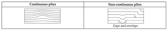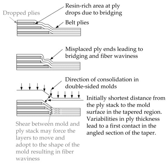 If layers can shear/slip over one another, the additional length can be accommodated by producing so-called “bookends” [18], which are shown in Figure 11c. However, if the tack between the plies is too high, axial compressive stresses are built up in the layers which may form wrinkles.