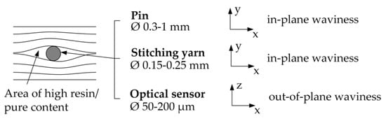 The decision as to whether these unwanted irregularities are considered as manufacturing features (effects), or as defects, depends on the size, number, and location in the component. Those allowance limits depend on the strength and stiffness reserve at the location of the feature, as well as on functional requirements (e.g., water tightness). The assessment of manufacturing effects further depends on the industry. In the aviation industry, the allowance limits for defects are very restricted, while in the automotive industry the need for short cycle times leads to a trade-off between robust processes and tolerated manufacturing imperfections. To this point, there is still no generally accepted approach to quantitatively support accept/reject/repair decisions and make a consistent assessment of wavy layers in composites. If the effect is termed to be a defect, typically a deviation from design must be requested in the aviation industry and an individual decision must be made on “use as is”, repair, or reject entirely. In some cases, experiments on representative test samples are performed at the subcomponent-level on a statistical basis. However, this is both time consuming and cost intensive. It is necessary to strive for a fiber-oriented and in particular a manufacturing-oriented design and construction of composite components. Towards this goal, design and production engineers aim to expand the permissible margin of safety by assessing the effect on stiffness and strength of those production effects (i.e., fiber waviness, porosity, delamination, etc.). Additionally, they aim to reduce or, in the best case, avoid them on the process side, increasingly with the help of finite element based process simulations, such as in [3,4,5].