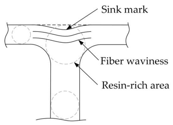 Fiber misalignment in general, and fiber waviness specifically, often originate from the labor-intensive preform placement into the mold cavity prior to infiltration and curing steps. The quality of draping is therefore strongly dependent on the skill and experience of the operator. Fiber waviness may be also formed due to mold closure effects when the fiber preform is compressed during mold closing, inducing tension forces around curvatures and bends, particularly in massive, geometrically-complex parts or when sliders move the plies away from its intentional position. In [22,23,24,25], it was stated that fiber waviness can also occur when slightly oversized preforms are forced to fit into a mold cavity. This is not considered to be a manufacturing effect but more a design issue, as this problem can be solved by adapting the size of the ply.