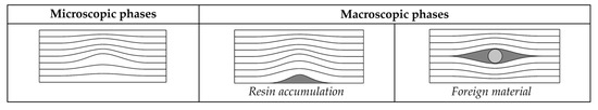 Wavy plies can appear in arbitrary shapes and locations and can principally be classified into in-plane and out-of-plane waves, whereas Nelson et al. [6] stated, that both show similar strength degradations. This paper aims to investigate out-of-plane waviness because of its more frequent occurrence compared to in-plane waviness. In this work, folds are considered as a special type of waviness with a maximum deviation of the fiber misalignment where a layer comes into contact with itself. Undulations are considered to be small-sized fiber misalignments at the mesoscopic level in the form of waves inherent to various preform manufacturing processes, such as woven textiles where fibers are undulated between warp and weft directions. Due to the undulations, woven fabrics show a systematically lower stiffness and different damage behavior compared to UD layers. This influence has been intensely investigated by [7,8,9,10]. Fiber misalignment is the general description for the angular deviation of nominal, intended fiber directions and; therefore, not corresponding to the designed fiber path. Misaligned fibers remain straight compared to curved fibers in waves, wrinkles, or undulations. Nevertheless, in many publications the term fiber misalignment is used as an umbrella term including waves, wrinkles, and undulations.