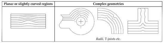 In automated fiber placement (AFP) [49], a fully automated manufacturing process for ribs or flat composite components, robot-guided fiber-reinforced prepreg tows are placed along a predetermined path on the three-dimensional tool surface using pressure and temperature. Due to the path steering of the head, the layers can be ideally orientated according to a pre-defined load path. However, different defects may occur (e.g., bridging, gaps between the deposited tow, in-plane or out-of-plane buckling of the tow, or a lifting of the tow on the outside of the tow as the radius narrows). Overall, the formation of these defects is a function of the steering radius chosen in the design process.