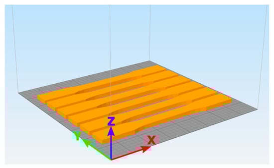 The specimens for compression tests had the shape and the main geometrical dimensions as indicated in Figure 3. The 3D CAD draw was converted in the STL format. The parallelepiped-shape specimen had 6 faces and for each face two triangles were sufficient to describe all the internal and external surfaces. Therefore, 12 triangles were enough for the triangulation of the entire parallelepiped-shape specimen. The slicing operation allowed the conversion of the STL file in a Gcode format in order to give the main instructions to the Funmat HT printer for the production process. As clearly indicated in Figure 4, the printing plane was the one and the layers were summed along the z direction; the same criss-cross sequence with rectilinear infill already employed for specimens for tensile tests was here used. The 12 specimens were printed in two different periods by giving two families composed by 6 specimens per each one. The main printing data were the same already seen for specimens for tensile tests, the only difference was for the perimeter beads [37,39]. In the present case, no perimeter beads were used because of the simplicity of the geometry and also to avoid unwanted reinforcement phenomena in the compression direction.