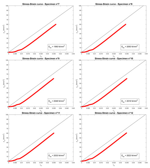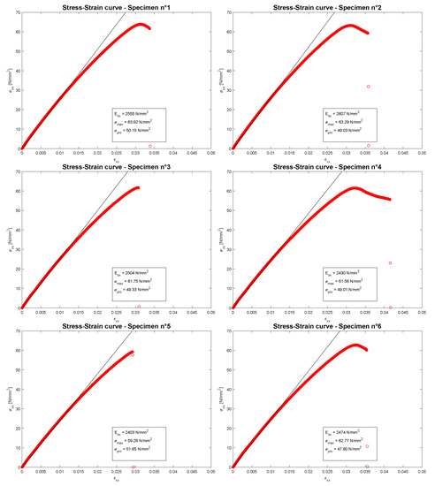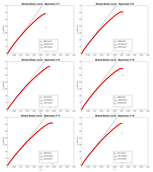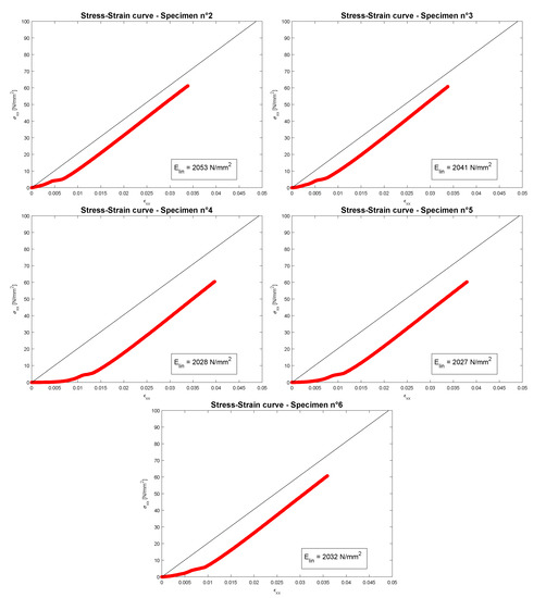 Figure 7 shows the stress-strain curves of the performed compression tests for the first group or family, only 5 specimens are given because the test for the first one was not successful and it was considered as failed. Figure 8 shows the stress-strain curves of the performed compression tests for the second group of 6 specimens belonging to family 2. In each image, only the linear elastic Young modulus in MPa is given because the tests were stopped when the machine MTS QTest arrived to the maximum applicable load P equals kN (which is the value of the employed load cell). For this applied load, only a linear elastic region is clearly showed and no proportional limit stresses and ultimate tensile strengths can be defined in an appropriate way. The black line represents the linear elastic region and its slope is the linear compression Young modulus obtained from a linear regression. In each image of Figure 7 and Figure 8, a toe point is clearly shown which is a point with a horizontal tangent between two different linear elastic regions. This toe point is due to a specimen misalignment, which is generated by a slipping in the grips, with a consequent realignment with respect to the load application direction. This phenomenon is a mechanical test characteristic and not a material characteristic. The standard reference ASTM D638 [44] foresees this toe point and it suggests to calculate the linear elastic Young modulus in the linear elastic region after this toe point. For this reason, the black line is drawn parallel to the red curve.