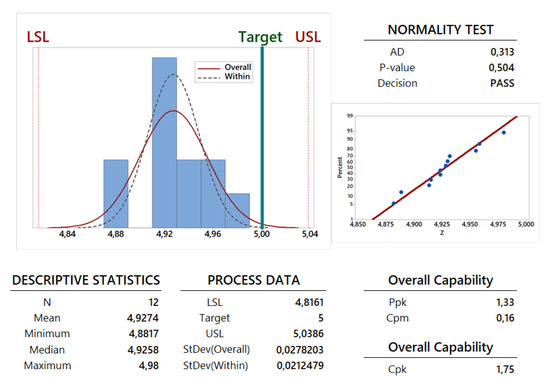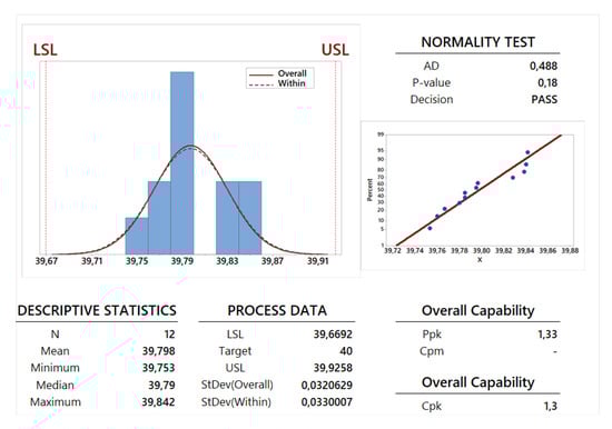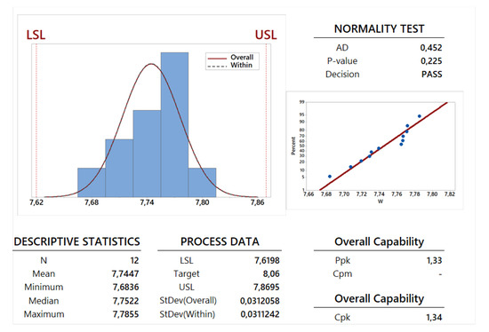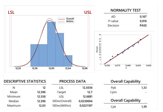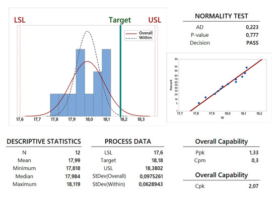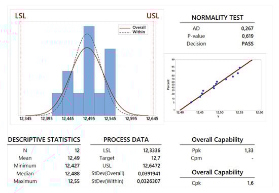 A preliminary study is performed to understand if the capability analysis can be developed using a normal distribution for the collected data. This study is provided using some information shown in Table 6 and in Figure 12, Figure 13, Figure 14 and Figure 15, the observation of the AD-value and the P-value is fundamental. The graphical summaries and probability plots shown in Figure 12, Figure 13, Figure 14 and Figure 15 and the AD-value and P-value given in the last two lines of the first part of Table 6 confirm that the normality test has been successfully passed by all the dimension parameters and the weight. Therefore, the Gaussian normal distribution can be employed for such an analysis: a mean value and a standard deviation can be calculated for the dimensions X, Y and Z and for the weight W. These two statistical parameters have been calculated for all the 12 specimens in order to perform a capability analysis in the long period (see the first part of Table 6) and for each family composed by 6 specimens in order to perform a potential or within capability analysis carried out in the short period (see the second and third part of Table 6). From a theoretical point of view, a process is usually more stable in the short period with respect to the long period. This feature is confirmed for the dimensions Y and Z. On the contrary, the stability in the long period is very similar to the stability in the short period in the cases of dimension X and weight W. This last feature comes from the observation of the values for standard deviation , and proposed in the related tables and figures and also by the observation of the Gaussian curves for overall (curves with a continuous line) and within (dotted curves) periods proposed in the process capability report shown in Figure 12, Figure 13, Figure 14 and Figure 15.