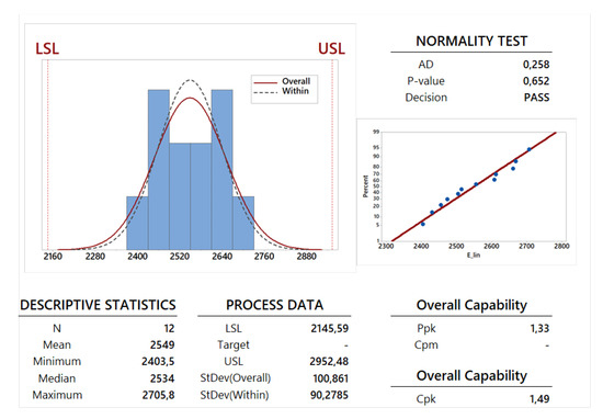 Graphical summary, probability plot and process capability report for the linear elastic Young modulus of compression test.