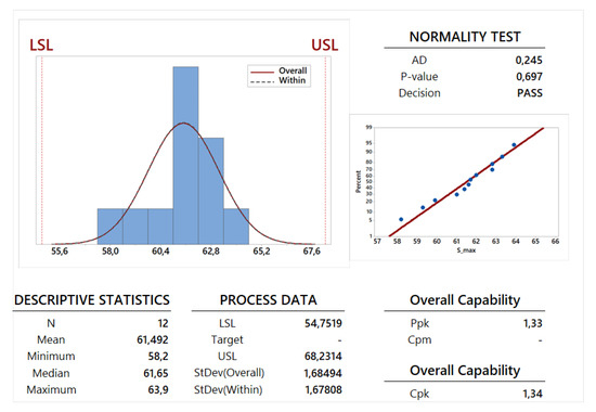 First of all, for an appropriate capability analysis, it is important to understand if the collected data can be represented using a normal distribution [41]. This information is provided in Table 5 and in Figure 9, Figure 10 and Figure 11 via two indexes defined as AD-value (Anderson Darling value) and the P-value (Probability value). If low values for AD are calculated, this feature means that the proposed data can be successfully investigated by using a normal distribution, this conclusion can be further validated via the determination of an high value for the P-index (this last one varies from 0 to 1 and it must be usually greater than an opportune treshold value, this value has been set equals 0.05 in the present paper). As shown in graphical summaries and probability plots reported in Figure 9, Figure 10 and Figure 11 and in the AD-value and P-value lines of Table 5, the normality test has been successfully passed by the two dimensions Y and Z and also by the weight W. The normal distribution analysis allows the calculation of a mean value and a standard deviation . These two parameters have been defined for all the 12 specimens (see the first part of Table 5) giving an overall capability analysis defined in the long period. In the second and third part of Table 5, the capability analysis has been separately performed for the first and second family, each one composed by 6 specimens; this type of analysis is defined as potential or within capability analysis because it is carried out in the short period. By definition, a process is usually more stable in the short period with respect to the long period because in the short period there are fewer dispersion factors in the production process. This conclusion is confirmed for both the dimensions Y and Z and also for the weight W: this feature is clear from the observation of the values for standard deviation , and proposed in the related tables and figures and also by the observation of the Gaussian curves for overall and within periods proposed in the process capability report shown in Figure 9, Figure 10 and Figure 11 (the dotted Gauss curve is always higher and narrower than the Gauss curve with a continuous line). The calculation of the mean value and the standard deviation allows the definition of a range between an Upper Specification Limit (USL) and a Lower Specification Limit (LSL). In the present study, a -level equals 4 has been imposed and the limits are calculated as and . This choice gives that the of the next produced specimens should have geometrical dimensions and weights inside the range with limits USL and LSL. These results confirms how the use of the FDM technology for polymeric materials is a good quality process as demonstrated by the successfully use of the -level equals 4.