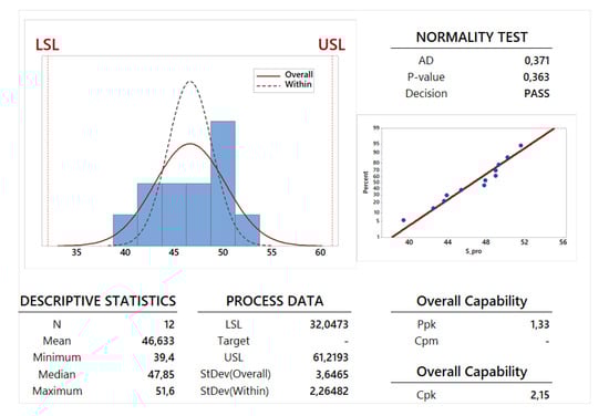 The capability analysis is performed using a normal distribution for the presented data. The correctness of the use of the normal distribution is confirmed by the observation of the AD-values and P-values given in Figure 16, Figure 17 and Figure 18 (see the related graphical summaries and probability plots) and in the last two lines of the first part of Table 7: all these information confirm that the normality test has been successfully passed by all the mechanical parameters. Therefore, the Gaussian normal distribution can be used for this analysis and a mean value and a standard deviation can be calculated for the linear elastic Young modulus , the ultimate tensile strength and the proportional limit stress . The mean value and the standard deviation have been calculated for all the 12 specimens in order to perform a capability analysis in the long period (see the first part of Table 7). The 12 specimens have been then grouped in two families (each one composed by 6 specimens) in order to perform a potential or within capability analysis carried out in the short period (see the second and third part of Table 7). In general, a process is usually more stable in the short period with respect to the long period. This feature is confirmed for the all the calculated mechanical parameters as clearly shown by the observation of the values for standard deviation , and proposed in the related tables and figures, and also by the observation of the Gaussian curves for overall and within periods proposed in the process capability report shown in Figure 16, Figure 17 and Figure 18.