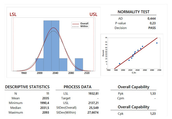 The mechanical property obtained from the compression tests is only the linear elastic Young modulus because the tests were stopped when the machine arrived to the maximum applicable load P equals kN: for this maximum value, only a linear elastic region is clearly showed and proportional limit stresses and ultimate tensile strengths cannot be defined in an appropriate way. Therefore, Table 4 shows only the data for the linear elastic Young modulus. Moreover, the first family contains only 5 specimens because the first one did not give correct results in the related compression test. The capability analysis for the linear elastic Young modulus has been performed using a Gaussian normal distribution because the AD-value and P-value proposed in the graphical summaries and probability plots of Figure 19 and in the last two lines of the first part of Table 8 confirm the validity of this approach for such a set of data. The mean value and the standard deviation have been calculated for all the 11 specimens in order to perform a capability analysis in the long period (see the first part of Table 8) and for each family in order to perform a potential or within capability analysis carried out in the short period (see the second and third part of Table 8). In general, a process is usually more stable in the short period with respect to the long period [41]. This feature is not confirmed by the values for standard deviation , and proposed in the related table and figure and also by the observation of the Gaussian curves for overall and within periods proposed in the process capability report shown in Figure 19. This inconsistency could be due to the small size of the specimens and the small number of produced and tested specimens.