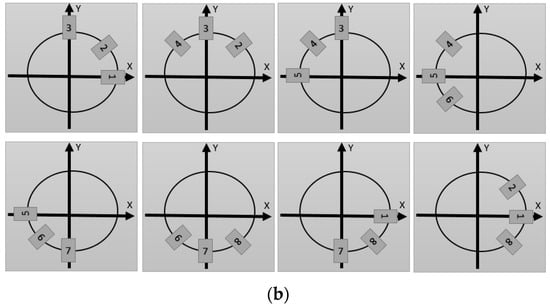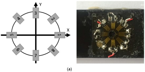 Pronounced local heterogeneity and defects such as pores and small cracks can be present in the material. Moreover, the material may be damaged due to the drilling procedure itself. In order to obtain sufficient strain information in different directions during one drilling process, minimizing the errors induced by the factors mentioned above, a special strain gauge with eight grids was employed in the present work. The utilized eight-grid strain gauge and the position of the grids 1 to 8 are shown in Figure 2a. Note that only the strain information of three grids from the strain gauge is required for the residual stress evaluation. Figure 2b illustrates eight different combinations of strain gauge grids adopted in the present work. By direct comparison of the strains determined and the calculated stress distributions from different strain gauge combinations, information regarding local heterogeneity and defects can be deduced. Eventually, the optimal combination of strain gauges could be established based on this approach. For measuring the residual stresses in CFRP, the strain gauges 1 and 5 were always aligned with the carbon fiber direction X. The choice of the orientation between the fiber and the strain gauge affects the reliability of the stress results, as was already shown in [].