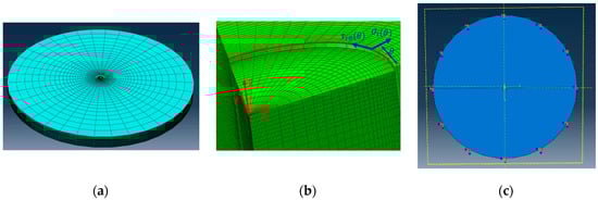 (a) ABAQUS finite element analysis (FEA) model used for the calculation of coefficients in the orthotropic material, (b) local cylindrical coordinate system for imposing loads at the side surface of the hole and (c) mechanical boundary conditions prescribed at the bottom surface of the sample.
