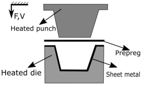 Hybridization of the metallic component and the CFRP can be mainly achieved through four different approaches. The hybridization can be realized by separate forming of the metallic component and manufacturing of the CFRP part, followed by joining using adhesives []. However, this kind of approach requires an overall long processing time []. It is well known that the metallic component and the CFRP can be joined by various other downstream processes, such as riveting and screwing. However, these approaches create additional weight and may lead to fiber damage [,]. Welding enables the joining of CFRP and metal as well. Upon welding, the partial melting of the matrix material within the CFRP leads to adhesive bonding and interlocking to the metal surface []. However, this process needs additional efforts and may yield local defects due to high temperature []. Alternatively, the manufacturing of hybrid materials can be realized in a one-step process, also referred to as intrinsic manufacturing, where the hybridization of different materials is exclusively realized by the forming process of the metallic and the CFRP component. Intrinsic manufacturing offers a fast and direct way of fabricating hybrid components and structures without the necessity of subsequent joining processes. A review on various technologies of joining of CFRP and metals can be found in [].