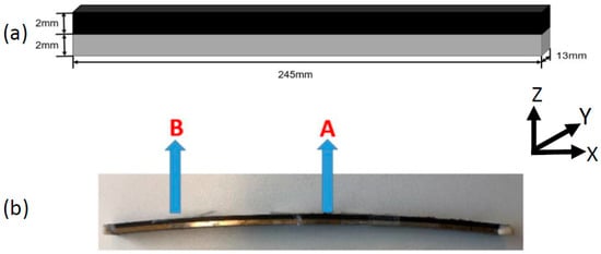 (a) Dimension of the CFRP/metal hybrid component used for residual stress analysis through the hole-drilling method (HDM), (b) deformation of the CFRP/metal hybrid component induced by residual stresses (X is defined as fiber direction) (residual stresses at points A and B are to be measured and compared).
