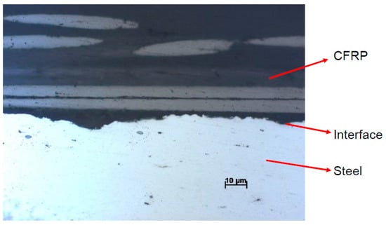 Figure 6 shows a cross-sectional view highlighting the microstructure of the hybrid sample obtained by using a digital microscope. From this micrograph, a good bonding between the CFRP and the steel can be deduced. The sample for microstructure visualization was cut alongside the longitudinal fiber axis. However, within single plies of the CFRP, the fibers are not perfectly straight and aligned. This is assumed to lead to scatter and will be analyzed and discussed in the remainder of the work.