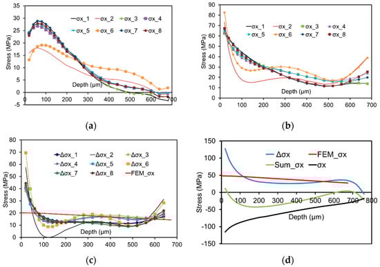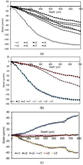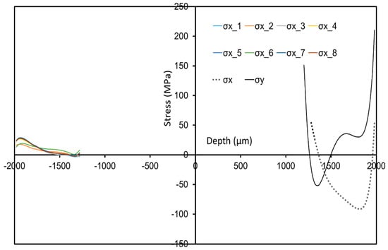 For investigating the consequences of a non-exact depth setting on the resulting residual stresses, the effect of different deviations from the ideal depth position was simulated in the procedure of evaluating the residual stresses. A key step is to precisely define the setting of the so-called zero depth, namely the surface of the sample. The ideal zero depth setting in this study was defined as follows: the removal of the coating, the foil of the strain gauge and the adhesives by successively drilling in steps of about 5–10 μm was used as a trigger signal. After each drilling, it was carefully checked whether the cutter came into contact with the surface of the sample through a camera. In Figure 10, the label (0 μm) indicates the ideal zero depth setting. This setting was employed for residual stress evaluation, while the labels (20 μm, 40 μm and 60 μm) imply that the adopted zero depth settings are 20 μm, 40 μm and 60 μm beneath the surface of the sample, respectively. From Figure 10, it can be clearly seen that the consequences of an incorrectly assumed hole depth are most pronounced in direct vicinity of the surface. Below the surface this further lead to an overestimation of the residual stress values. This effect diminishes, when the depth of the hole increases.