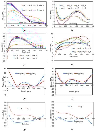 In Figure 9e, the experimentally determined residual stresses σx and σy (using a standard strain gauge with three grids) at the center point A on the metal sample, which is not bonded with CFRP, are shown. It can be seen that σx resembles a tensile stress with a maximum value of about 20 MPa close to sample surface eventually decreasing as the depth increases. σy is characterized by tensile stresses with a maximum value of about 70 MPa close to surface. This value also decreases as the depth increases. Figure 9f shows the experimentally determined residual stresses σx and σy using a standard strain gauge with three grids at the side point B on the metal sample without hybridization. Figure 9g shows the experimentally determined residual stresses σx and σy using a standard strain gauge with three grids at the center point A on the metal side after hybridization. It can be seen that σy is characterized by tensile stresses with a maximum value of about 210 MPa close to surface. Stresses decrease to zero at the depth of 500 µm and then convert into compressive residual stresses as the depth increases. In terms of σx, in a depth ranging from 50 to 600 µm compressive stresses are revealed being characterized by a maximum value of −95 MPa at the depth of 180 µm. The stresses σx and σy on the side point B at the metal side after hybridization are shown in Figure 9h. It can be seen that the values are smaller as compared to the center point; however, their characteristic courses are somehow similar. In addition, it can be seen that the residual stresses in the steel after hybridization are larger than within the steel sample before hybridization due to the formed residual stress related to the hybridization process upon cooling. The reasons why the residual stresses in the metal part are much larger than in the CFRP already have been detailed before.
